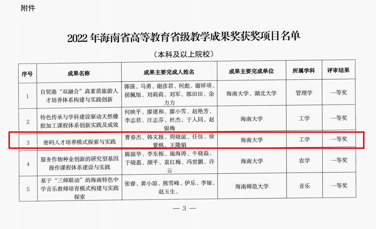 近日,海南省教育厅公布了2022年高等教育省级教学成果奖评审结果,必赢官网《密码人才培养模式探索与实践》项目荣获省级教学成果奖(本科及以上院校组)一等奖,完成人:曹春杰、韩文报、周晓谊、任佳、徐紫枫、王隆娟等。