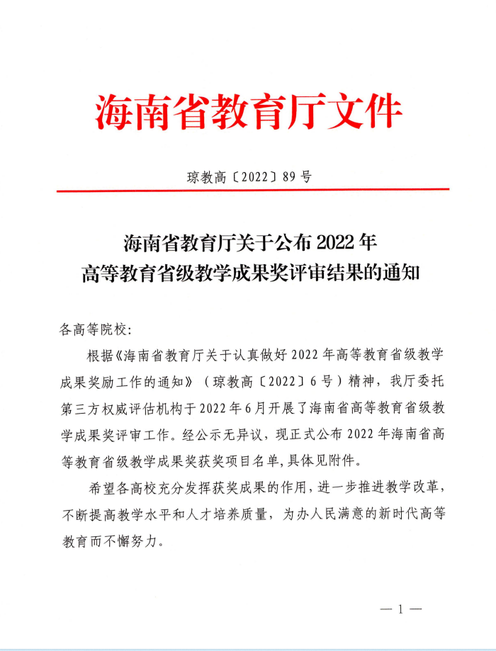 喜报:必赢官网荣获2022年海南省高等学校教育教学成果一等奖