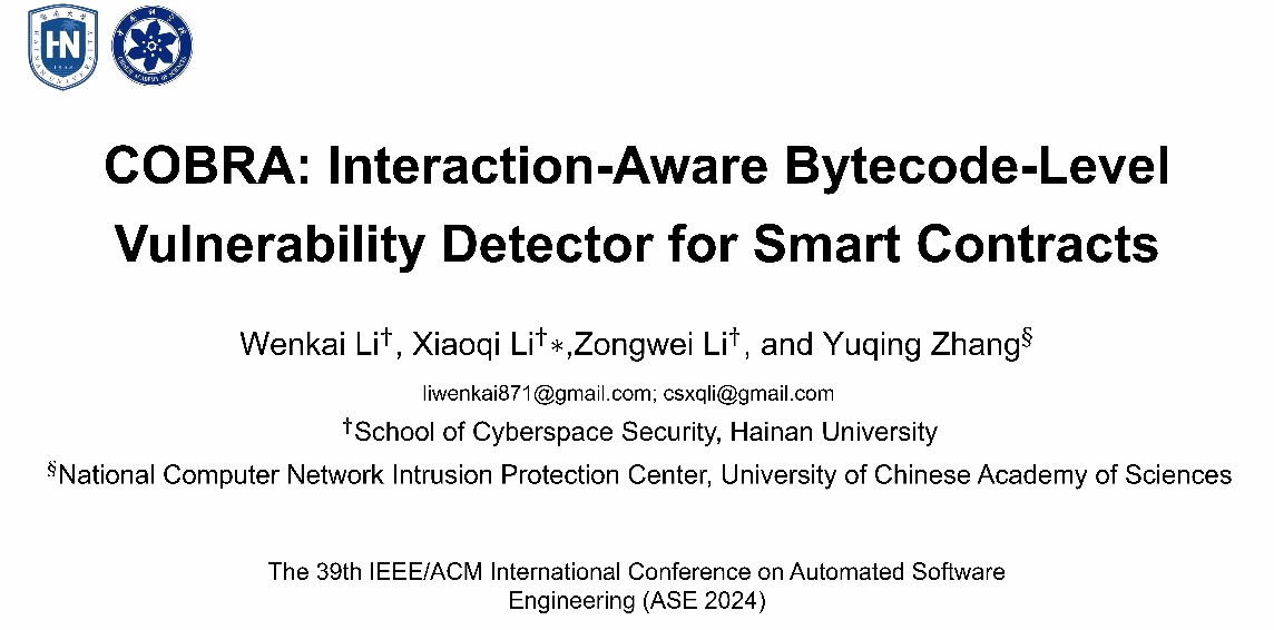 国际顶级学术会议ASE(IEEE/ACM International Conference on Automated Software Engineering)在10月27日起在美国加州萨克拉门托召开。必赢官网博士研究生李文凯(第一作者)、副教授李晓琦(通讯作者)、特聘教授张玉清、硕士生李宗维在ASE上发表长篇Regular Research论文“COBRA: Interaction-Aware Bytecode-Level Vulnerability Detector for Smart Contracts”。ASE属于CCF A类学术会议,是软件工程研究领域的国际顶级学术会议。