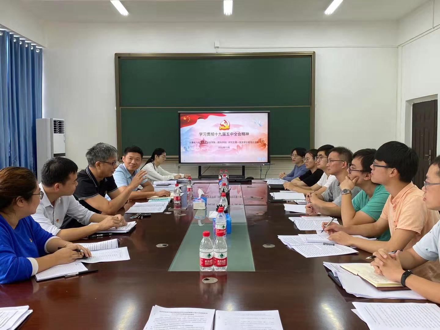 首先,支部书记余学志带领大家集中学习了党的十九届五中全会精神,围绕相关内容分享了自己的学习心得。党员郑鑫结合自己研究方向讲到视频监控在平安中国的建设中扮演着一个非常重要的角色,没有网络安全就没有国家安全,平安中国的建设需要大家的共同努力。随后党员麦建斌、曹凯、吴倩、陶方舰分别结合自己的专业和生活分享了自己的学习心得。