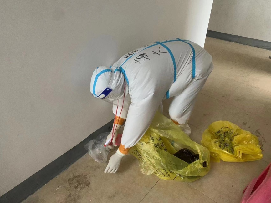 针对居家隔离人员,秦小立还要上门进行核酸检测信息采集。为保障隔离区住户健康的生活环境,秦老师还和队友们一起为隔离区住户贴封条、对生活垃圾进行消杀及转运等。事无巨细,秦小立总是全力以赴,默默奉献,尽心尽责尽最大能力阻断疫情的传播链。为了防疫安全,手机每天要反复酒精消毒,防护服里汗水如注,手也泡得发白,但他每天更关心是核酸检测结果,最让他欣慰的是看到当天检测结果全部阴性,他说:这是我每天工作的“最好的回报”。