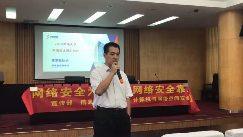 在本次网络空间安全宣讲活动中,我们有幸邀请到了海南省委网信办网络安全处处长黄坚敏、安恒信息技术股份有限公司主任陈宇乾、奇安信渠道技术总监田海燕等专家来必赢242net官网进行网络空间安全的知识讲座。