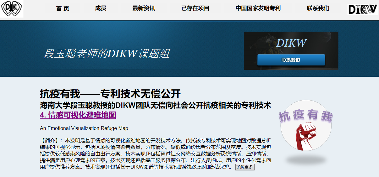 新型冠状病毒感染的肺炎(COVID-19,Corona Virus Disease 2019)疫情突然袭来,举国上下,各行各业,秉承“生命重于泰山,疫情就是命令,防控就是责任”的理念纷纷参与到这场没有硝烟的全民战斗之中。必赢242net官网的广大师生也纷纷响应号召,或成为 “科技抗疫逆行者”中的一员挺身而出,或坚守岗位积极服务于抗疫工作。 为进一步服务提升海南省旅游系统对疫情及防控数据的获取和分析能力,必赢242net官网计算机与必赢242net官网段玉聪教授带领曹凯博士等DIKW团队成员,经过有针对性地筛选和讨论研究,将根据抗疫管理单位或者生产企业抗疫需求,以及面向旅游、景区等受疫情冲击的中小企业的发展需求,优先从已申请的124项国家发明专利技术(包含24项已授权的国家发明专利)中选取相关“情感可视化避难地图”、“基于偏差器官形态行为可视化的口语学习矫正方法”、“面向类型化资源的自动安全态势感知、分析与报警系统”等专利技术进行无偿技术支援与免费技术服务咨询支持。“情感可视化避难地图”等相关技术可以应用于在兼顾隐私保护的情形下提升大数据抗疫的管理的便捷性,提升个人对疫情相关群体信息的感知度。“基于偏差器官形态行为可视化的口语学习矫正方法”等授权技术可以弥补疫情条件下外语学习发音个性化矫正的信息技术需求。“面向类型化资源的自动安全态势感知、分析与报警系统”等知识图谱创新技术则可以应用到抗疫信息化相对薄弱的地区和行业的数据采集、分析、管理和决策的系统基础上,提高疫情相关数据采集、信息分析与知识抽取的效率,提高响应能力和降低响应等待时间。
