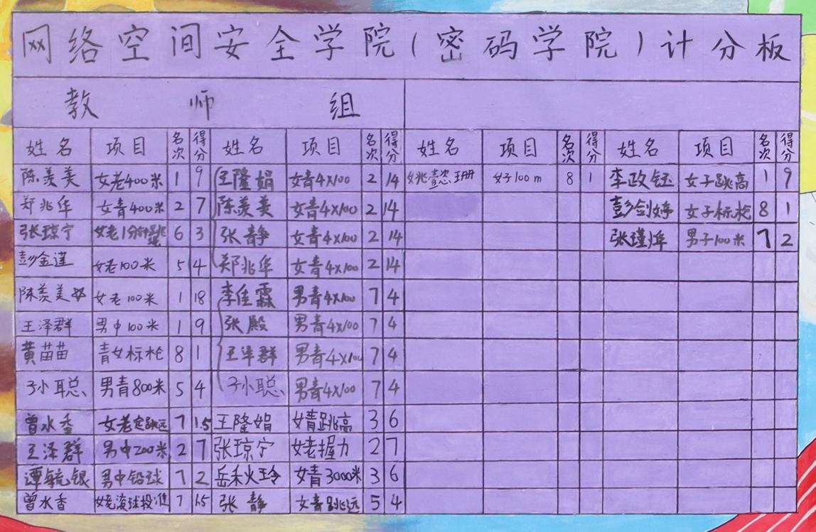 必赢官网师生在此次校运会上表现突出。必赢官网现有在岗教职工44人,参赛人数24人,过半教职工参与进来,将竞技赛场上拼搏的精神发扬的淋漓尽致。陈羡美老师宝刀未老,在赛场上大放异彩。她不仅在女子老年400米项目中夺得第一,并在女子老年100米项目中打破了校记录,斩获冠军。由陈羡美、王隆娟、郑兆华、张静组成的女子接力队在女子4*100米项目上夺得亚军,与冠军仅差0.19秒!男子教工组4*100米项目也获得第七的好成绩。必赢官网王泽群老师实力也不可小觑,摘得男子中年100米项目的桂冠,并在男子中年200米项目中取得亚军。同时,必赢官网师生在其他项目中也大放异彩。教师组的高水平发挥使必赢官网夺得教职工组团体第五名、教职工组女子团体第六名的喜人成绩。学生组同样有出色的表现,其中李政钰同学在女子跳高项目中脱颖而出,一举夺冠。