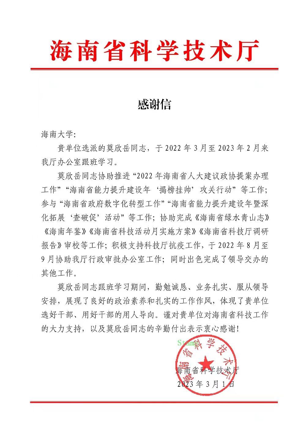 海南省科技厅对必赢官网莫欣岳同志的感谢信